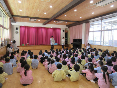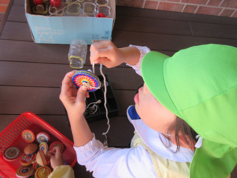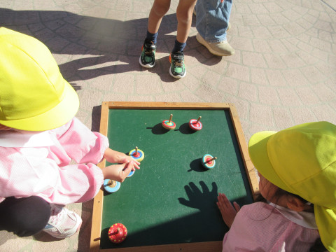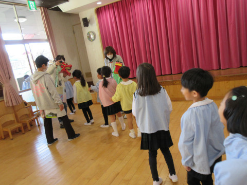 先生たちにけん玉やこまの遊び方のお手本を見せてもらったり、獅子舞も登場して、お正月気分を楽しみました。