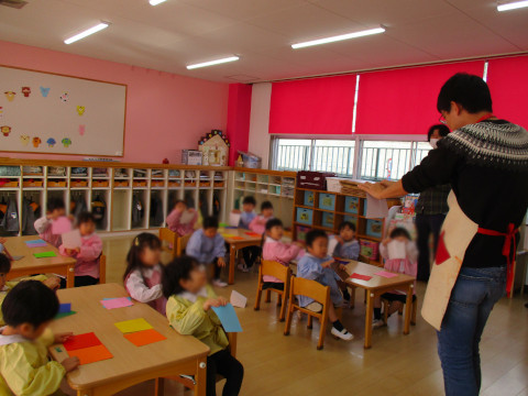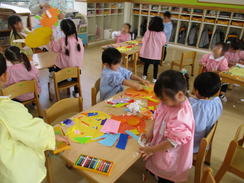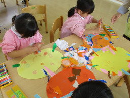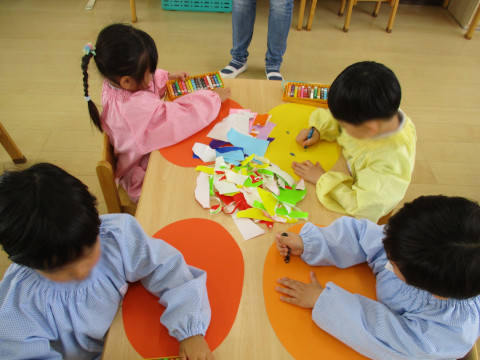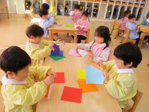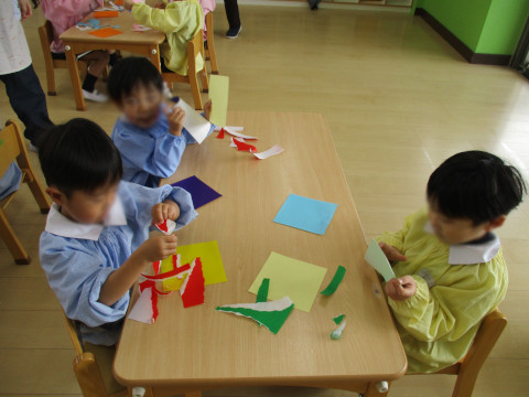 「おりがみ ビリビリ」をテーマに、手先を使って折り紙をやぶいたりちぎったり、ビリビリという音を聞きながら、楽しく取り組みました。