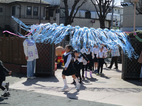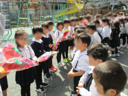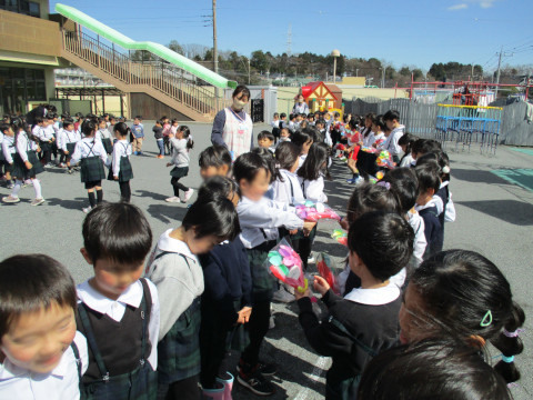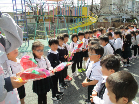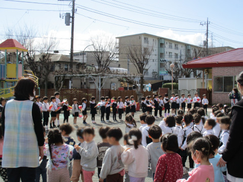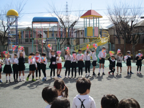 また、午後は、年長さんとのお別れ会がありました。 各クラスから年長さんへ「言葉のプレゼント」を、年中さんから年長さんへは色紙で作った「花束」をプレゼントしました。 お礼に、年長さんからは、各クラスへ歌と言葉のプレゼントがありました。