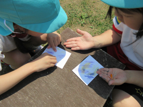 自然に親しむ体験活動「ネイチャーゲーム」の先生を招いて、年長組が裏庭で活動を行いました。 幼稚園の裏庭で摘んだお花を使って、色水遊びをしました!