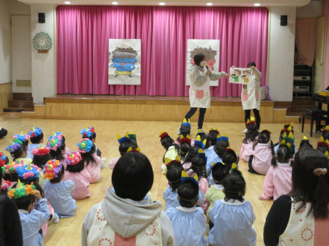 子どもたちが自分で作った鬼のお面をかぶって豆まきをして、赤鬼と青鬼を退治しました。